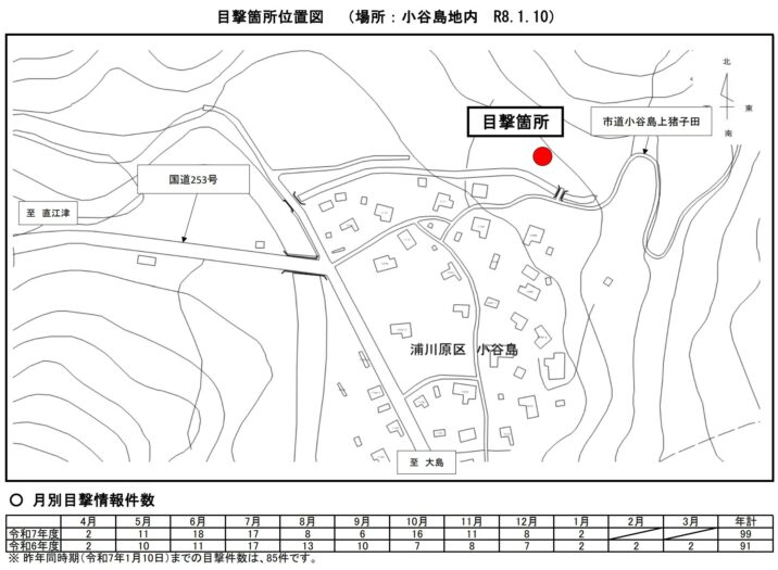【目撃情報】 1月10日(土)午前9時30分頃、浦川原区小谷島地内から北に100mの地点で体長80センチメートルほどのクマ1頭を目撃したとの通報が、午前10時40分頃、浦川原区総合事務所にありました。付近の方は、十分注意してください。 クマやイノシシを見かけた際は、環境政策課(電話025-526-5111)または総合事務所、警察署(電話110番)に連絡してください。