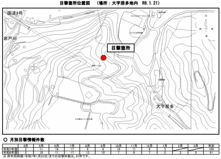 【目撃情報】 1月21日(水)午後11時50分頃、大字居多地内上越斎場から西に250mの地点でクマらしき動物1頭を目撃したとの通報が、午前0時10分頃、上越市役所にありました。付近の方は、十分注意してください。クマやイノシシを見かけた際は、環境政策課(電話025-526-5111)または総合事務所、警察署(電話110番)に連絡してください。
