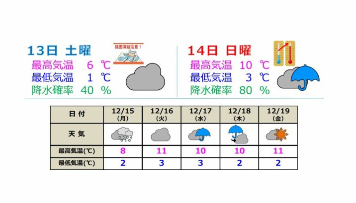 高田の天気予報 <13日(土)> ・午後は南の方から日が差してきそうですが、概ね曇り空の1日に ・朝は路面の凍結に注意警戒を <14日(日)> ・朝から雨の降る1日に ・最高気温は…