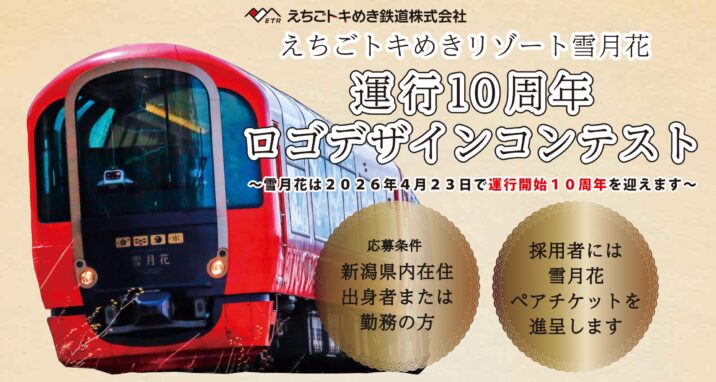 えちごトキめき鉄道は、リゾート列車「雪月花」が運行開始から来年4月で10周年を迎えるのに合わせて、これを記念したロゴデザインのコンテストを開き作品を募集しています。 えちごトキめき…