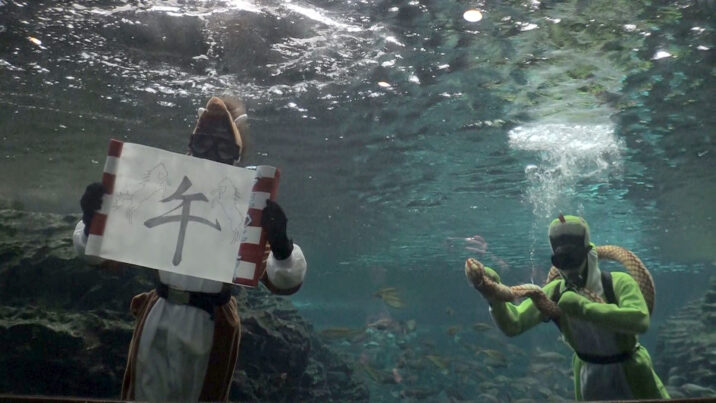 上越市立水族博物館うみがたりの大水槽に26日(金)、来年の干支「うま」に扮したダイバーが登場し、今年の干支「へび」からバトンを引き継ぎました。 およそ3万8000匹の魚が泳ぐ大水…