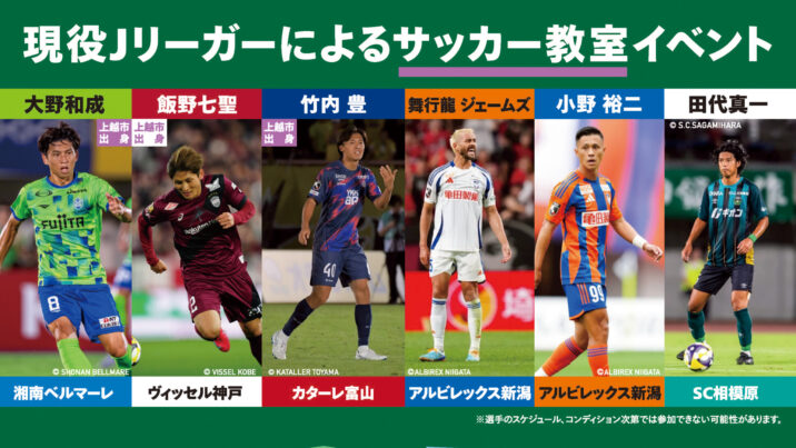 今年も一般観覧できます! 上越市出身のJリーガー大野和成選手、飯野七聖選手、竹内豊選手など、現役プロサッカー選手6人による地元小学生を対象にしたサッカーイベント「上越スポーツフェス…