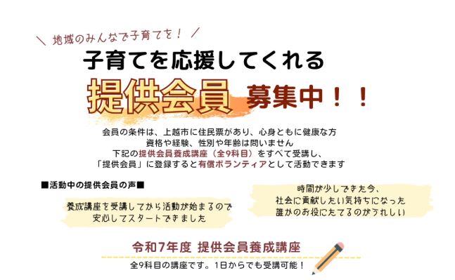 上越市ファミリーサポートセンターでは、有償ボランティアで子育てをサポートする「提供会員」を募集しています。子育てを応援する会員として必要な知識を学び、提供会員養成講座(全9科目)を…