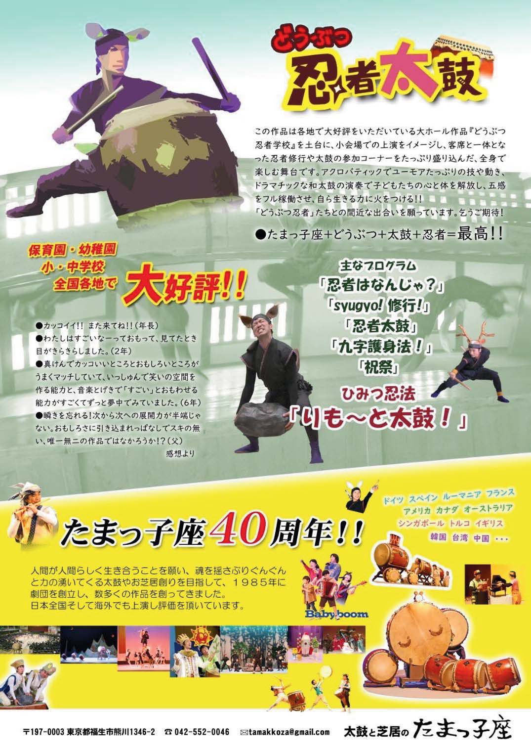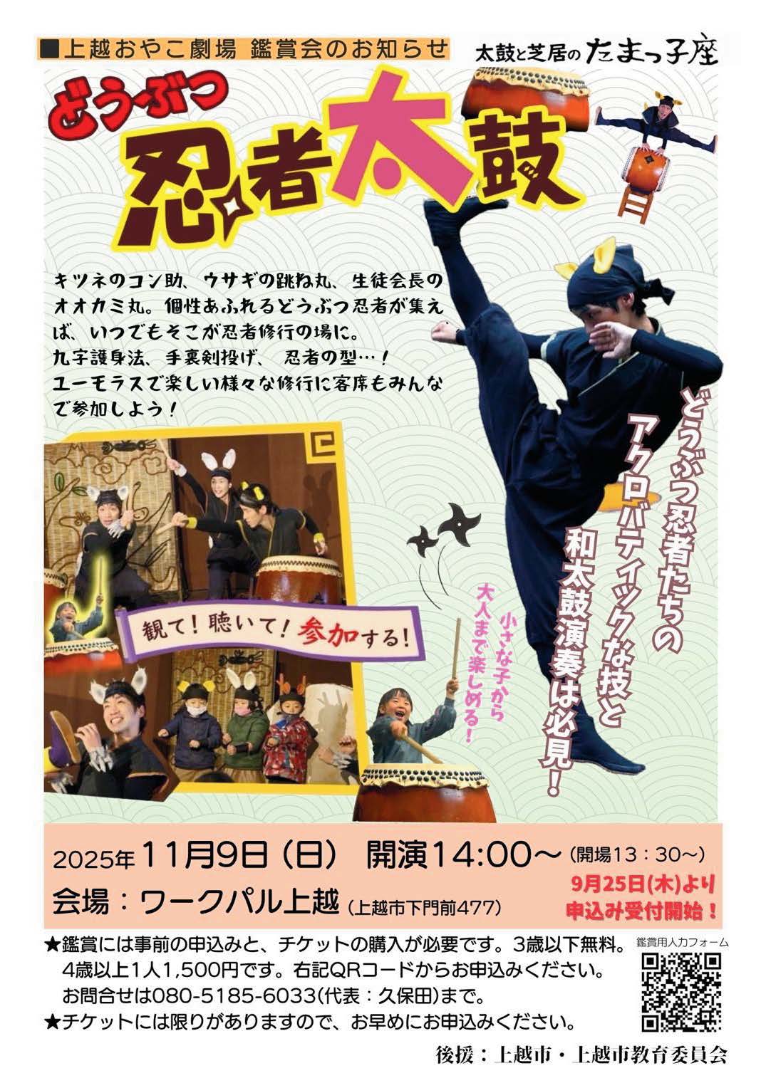上越おやこ劇場「どうぶつ忍者太鼓」の鑑賞会が11月9日(日)にワークパル上越で開催されます。アクロバティックでユーモアたっぷりの動きや和太鼓の演奏で子どもたちの心と体を開放し、五感をフル稼働。小さな子どもから大人まで全身で楽しめる舞台です。※鑑賞には事前の申し込みと、チケットの購入が必要です。