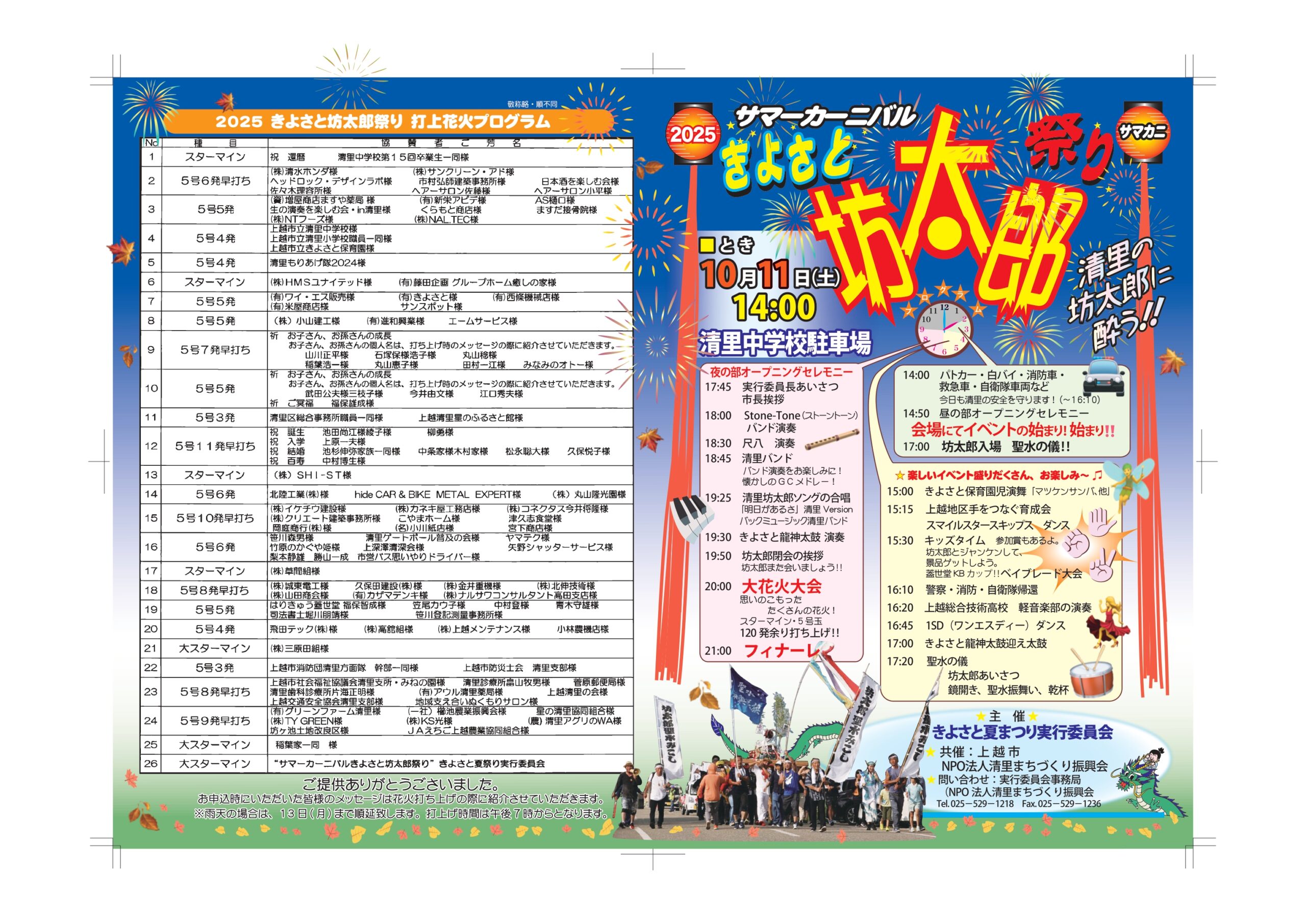 上越市清里区の夏まつり「サマーカーニバルきよさと坊太郎祭り」が10月11日(土)に開催されます。イベントでは、坊太郎復活の儀、パトカー・白バイ・消防車展示、ステージイベント、飲食の出店に加え、ベイブレードエックスの「BEYBLADEX S1大会 蓋世堂カップ」や、大花火大会が行われます。