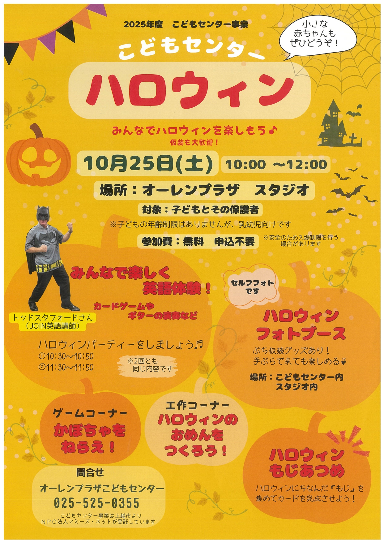 子どもと保護者を対象にしたハロウィンイベントが上越市のオーレンプラザで開催されます。JOIN英語講師のトッドスタフォードさんによる英語体験、ゲームコーナーや工作コーナーもあります。仮装も大歓迎です。是非お越しください。※安全のため入場制限を行う場合がございます。