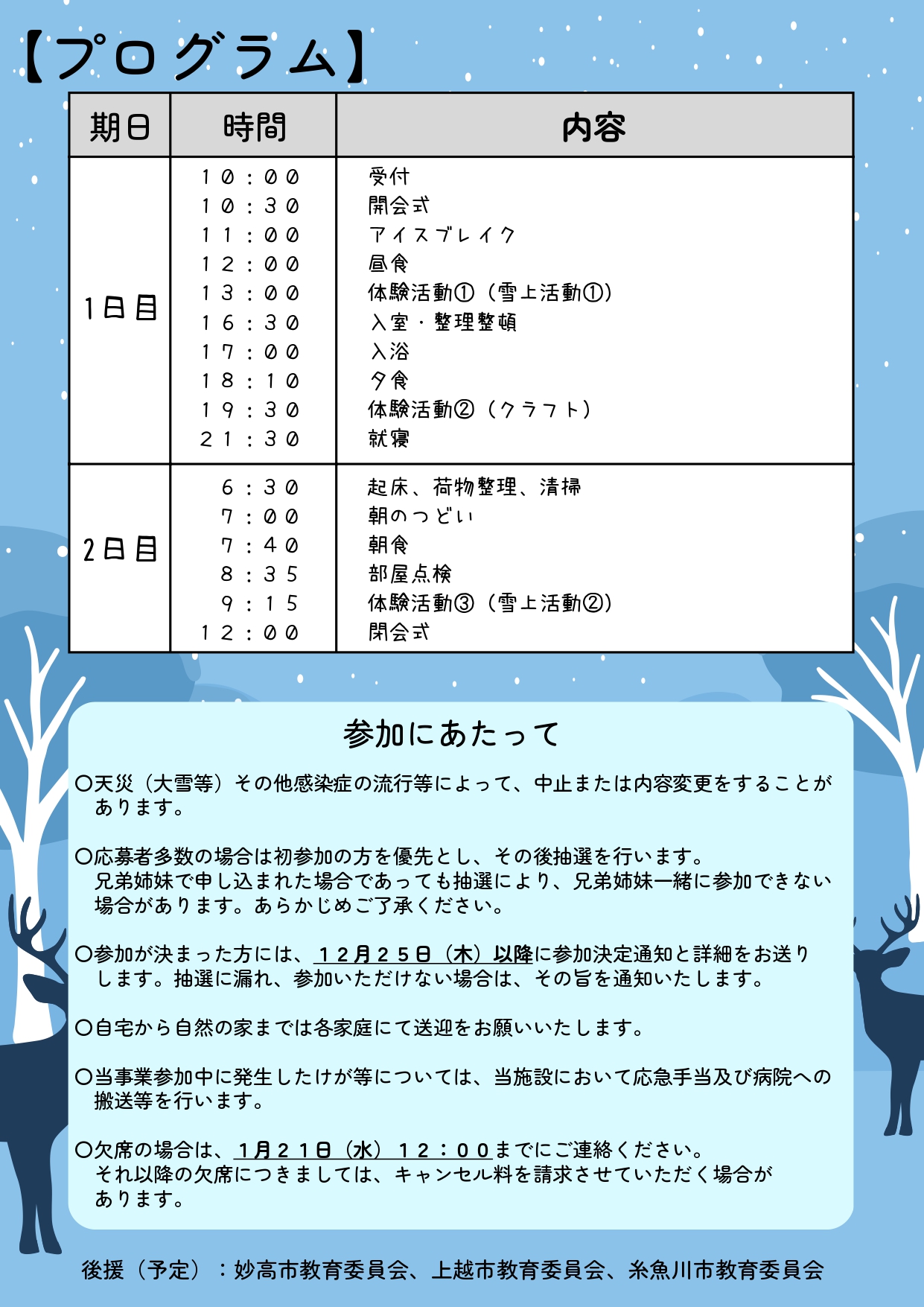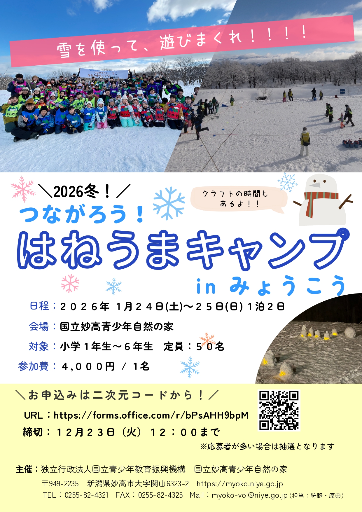 小学生対象の「つながろう!はねうまキャンプ inみょうこう」が1月24日(土)、25日(日)の1泊2日で開催されます。雪の中で楽しむプログラムやクラフト体験をします。