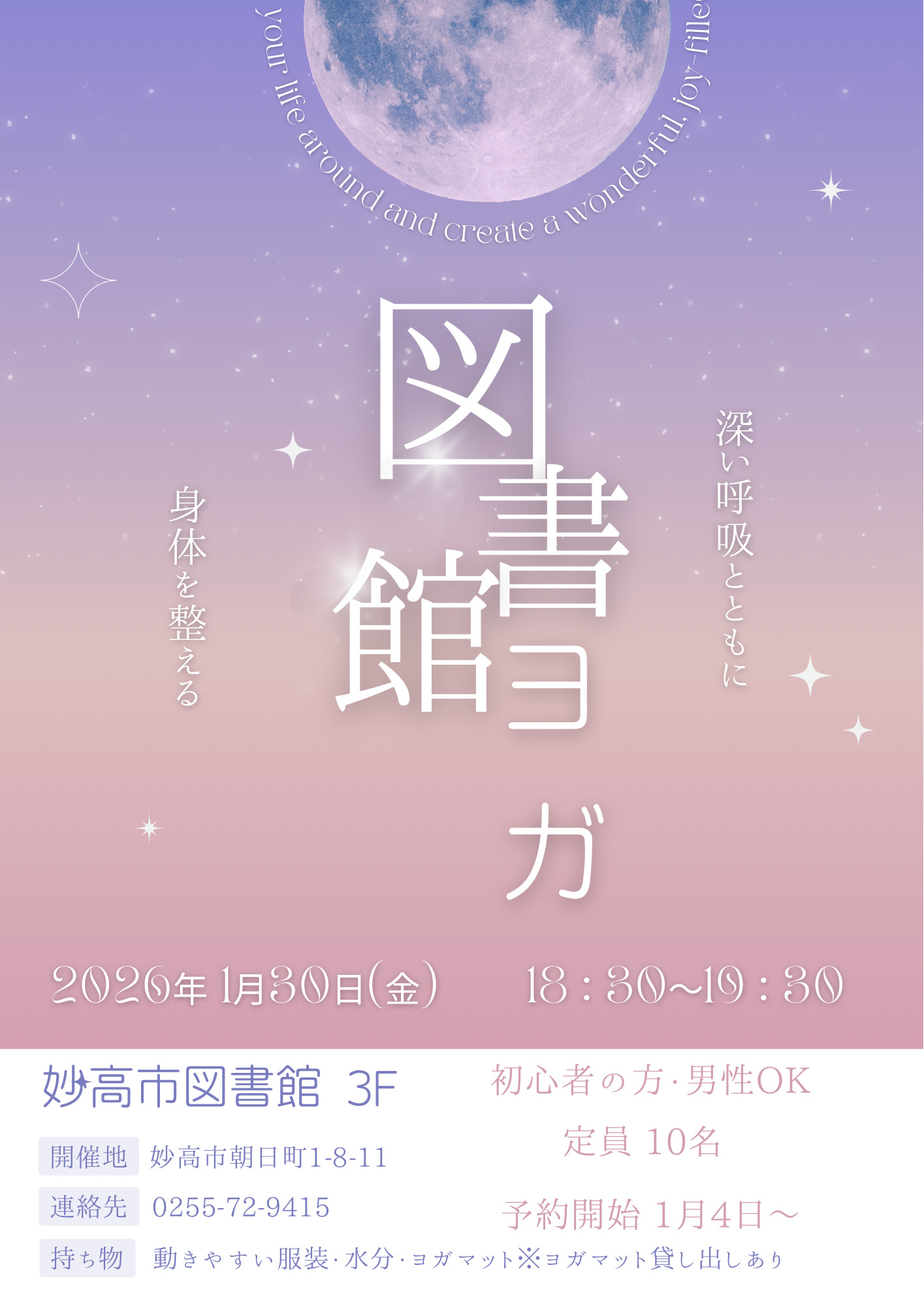妙高市複合施設まちなか+にて、「図書館ヨガ」が開催されます。図書館という空間の中で、深い呼吸とともに身体を整えます。初心者の方、男性も参加可能です。