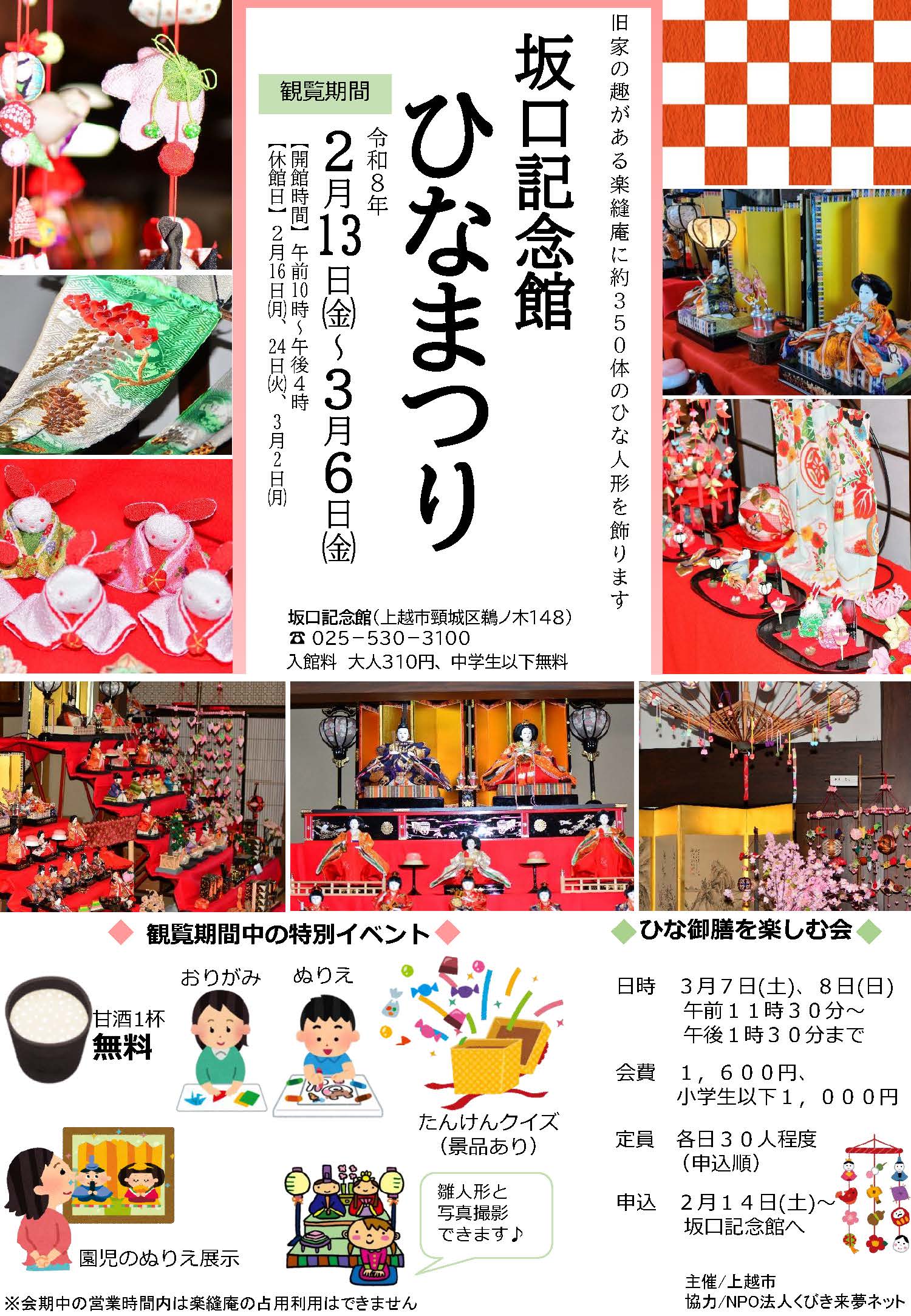 上越市頸城区鵜の木の坂口記念館で「ひな御膳を楽しむ会」が3月7日(土)、8日(日)に開かれまれす。