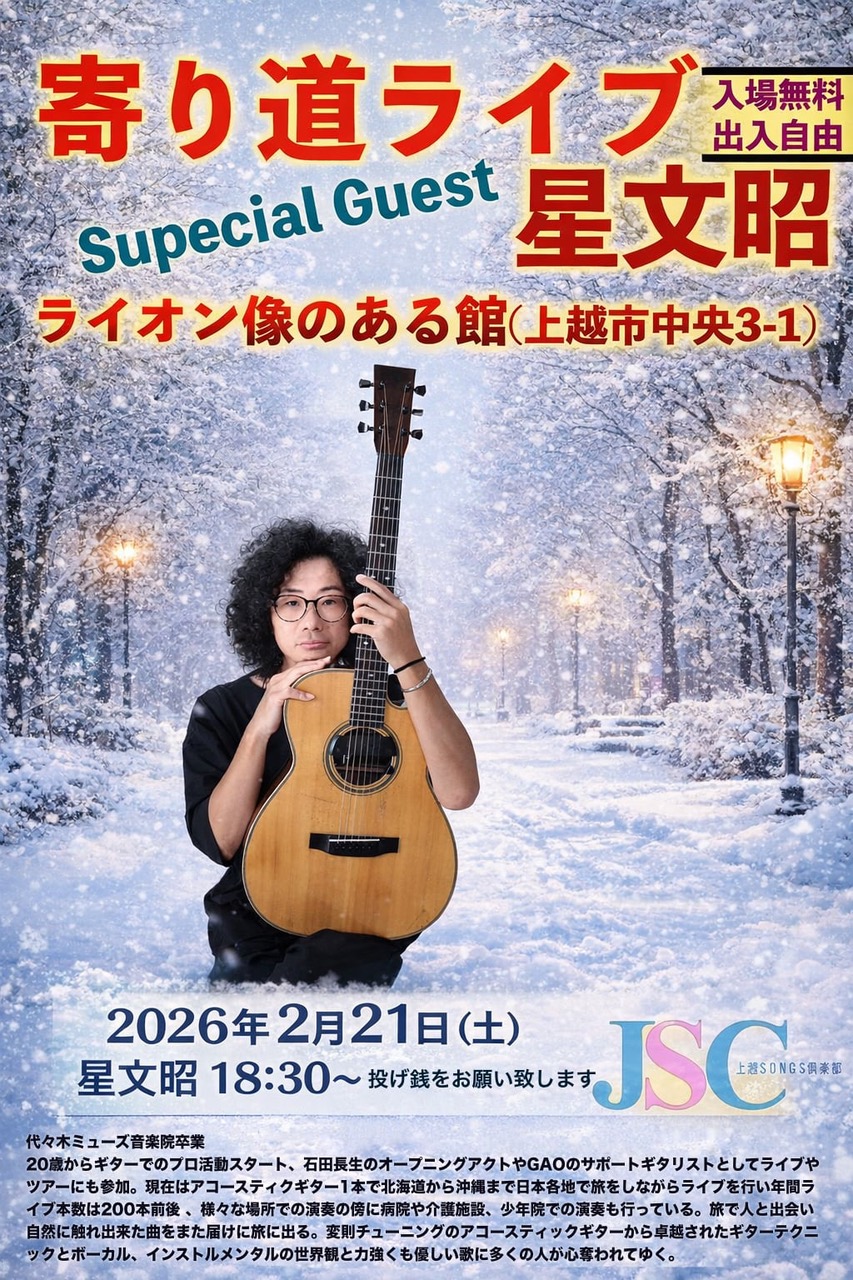 上越SONGS主催の「寄り道ライブ」に日本各地を旅するシンガーソングライターの星文昭さんが出演します。アコースティックギター1本で北海道から沖縄まで日本各地を旅しながら年間200本ほどライブ演奏しています。出演日は2月21日(土)のみで午後6時30分からです。