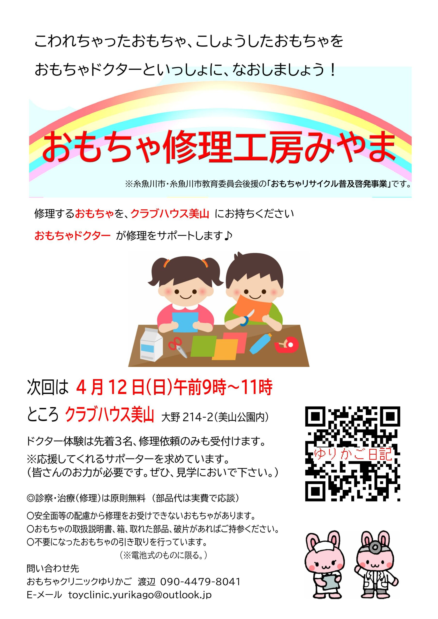 おもちゃドクターがこわれたおもちゃを修理してくれる「おもちゃ修理工房みやま」が4月12日(日)に糸魚川市の美山公園内「クラブハウス美山」に開設されます。修理するおもちゃをお持ちください。