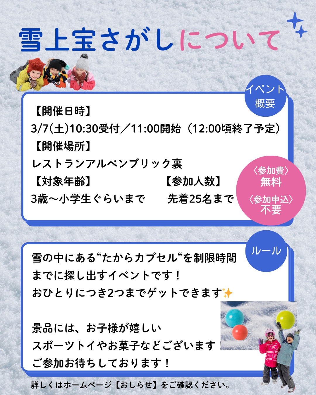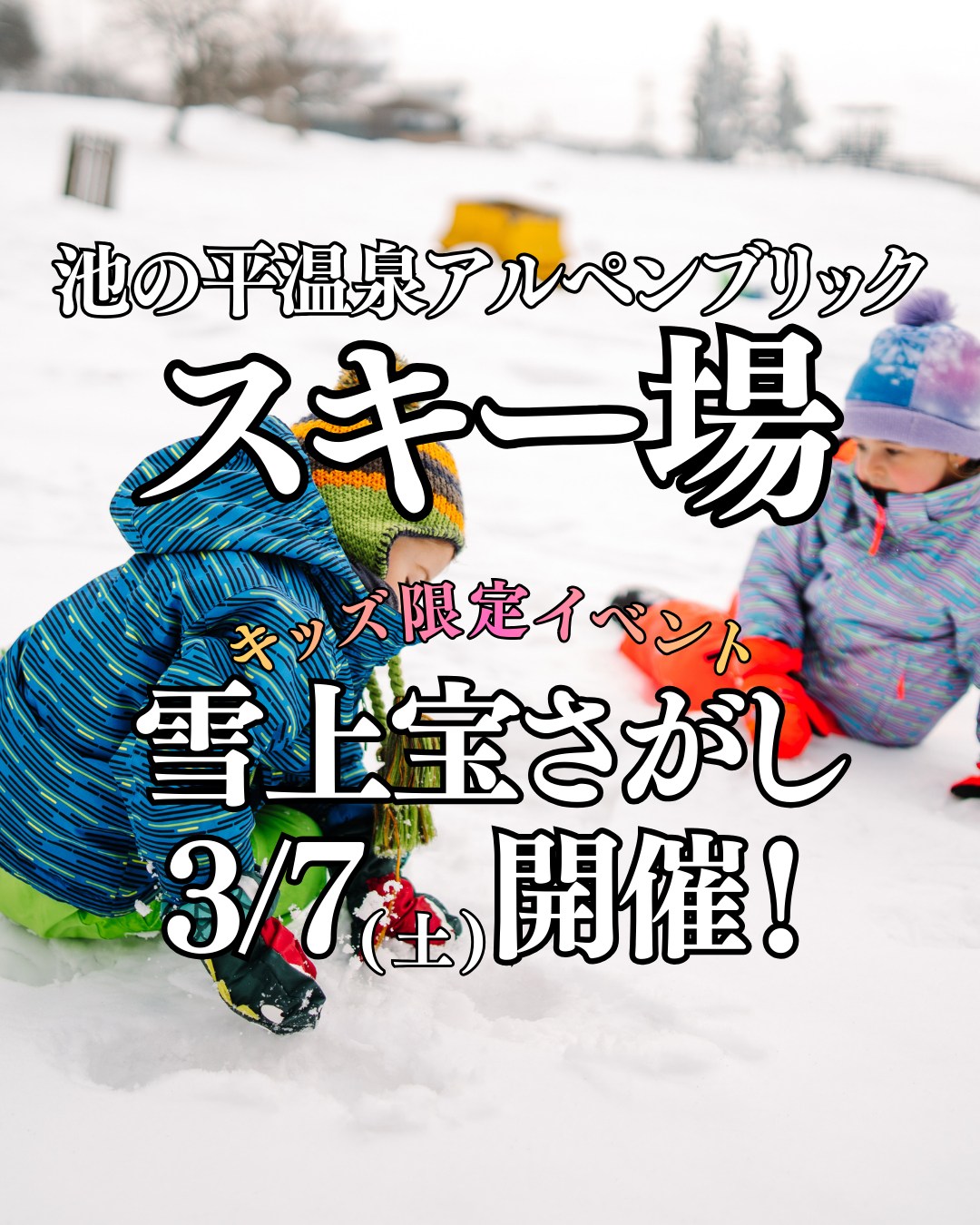 雪の中に隠された“宝カプセル”を探し出し、豪華景品と交換できるキッズ限定イベント「雪上宝探し」が池の平温泉アルペンブリックスキー場で開催されます。参加費無料で当日参加できます。