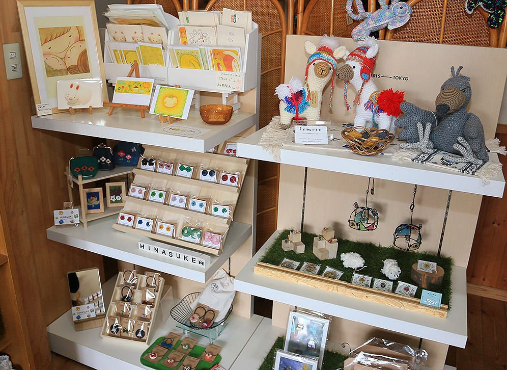 取り扱っている商品はアクセサリーが最も多く、そのほかにベビー小物、キャンドル、布小物、編みぐるみ、イラストなど、バラエティーに富んでいて、そのほとんどが一点もの。商品との一期一会の出会いが楽しめます。