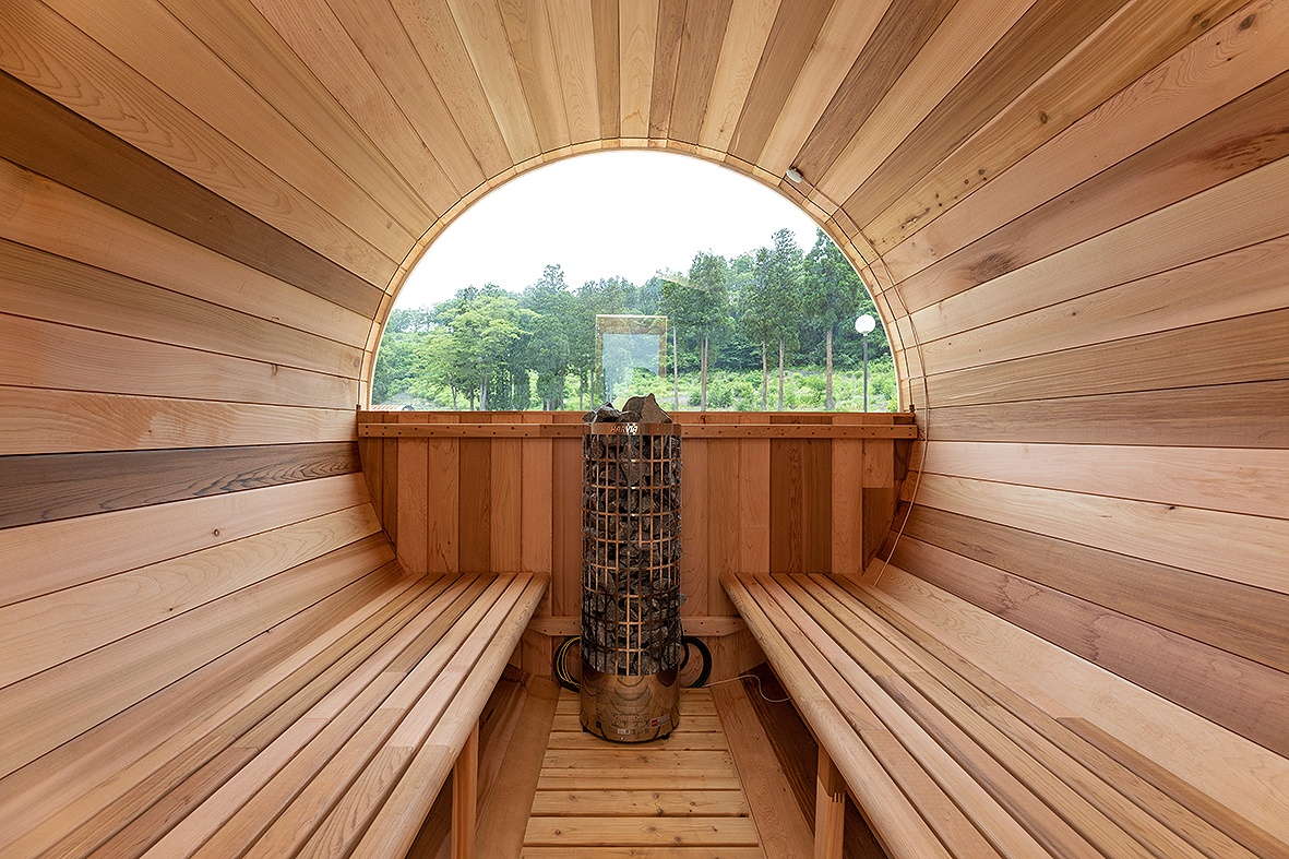 プールサイドには、室内から妙高山を見渡せるバレルサウナを2基設置しました。国産ヒノキ製と海外レッドシダー製と異なる仕様で、どちらも大自然の中でサウナ体験が楽しめます。