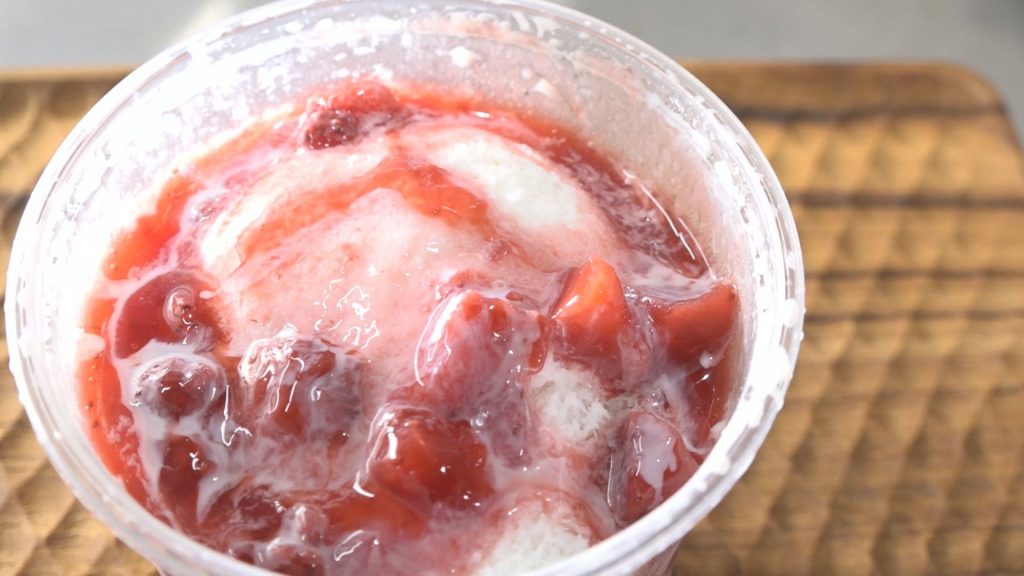 原料には三和区の三和牛乳を使った自家製ミルク液を使っています。トッピングに果肉たっぷりのフルーツソースをかけて完成です。ソースはイチゴ、キウイ、マンゴーの3種類です。