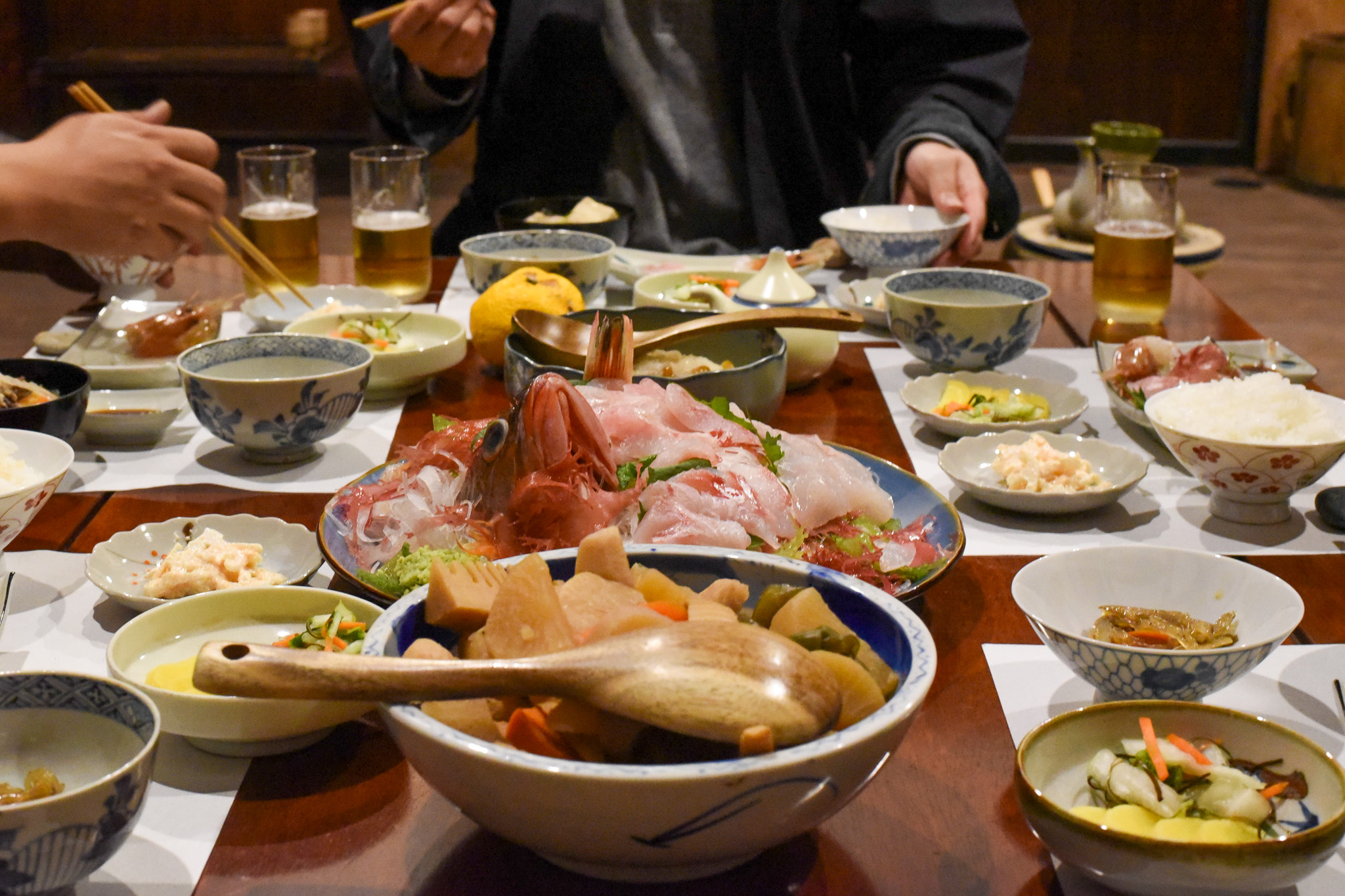 施設は夕食と朝食付きです。集落で採れた棚田米や地元野菜、近くの山で採れた山菜やキノコ、日本海で獲れた魚介類、湧き水など、地元の旬の恵みを用意してくれます。料理は提供されるのではなく、宿泊者自身が伝承人や地域の人たちと一緒に調理を楽しむ仕組みです。