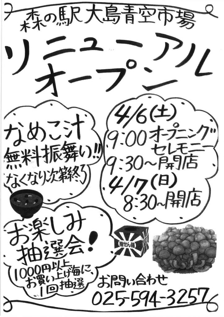 上越市大島区にある農産物直売所「森の駅 大島青空市場」がリニューアルオープンし、4月6日(土)7日(日)にイベントが行われます。