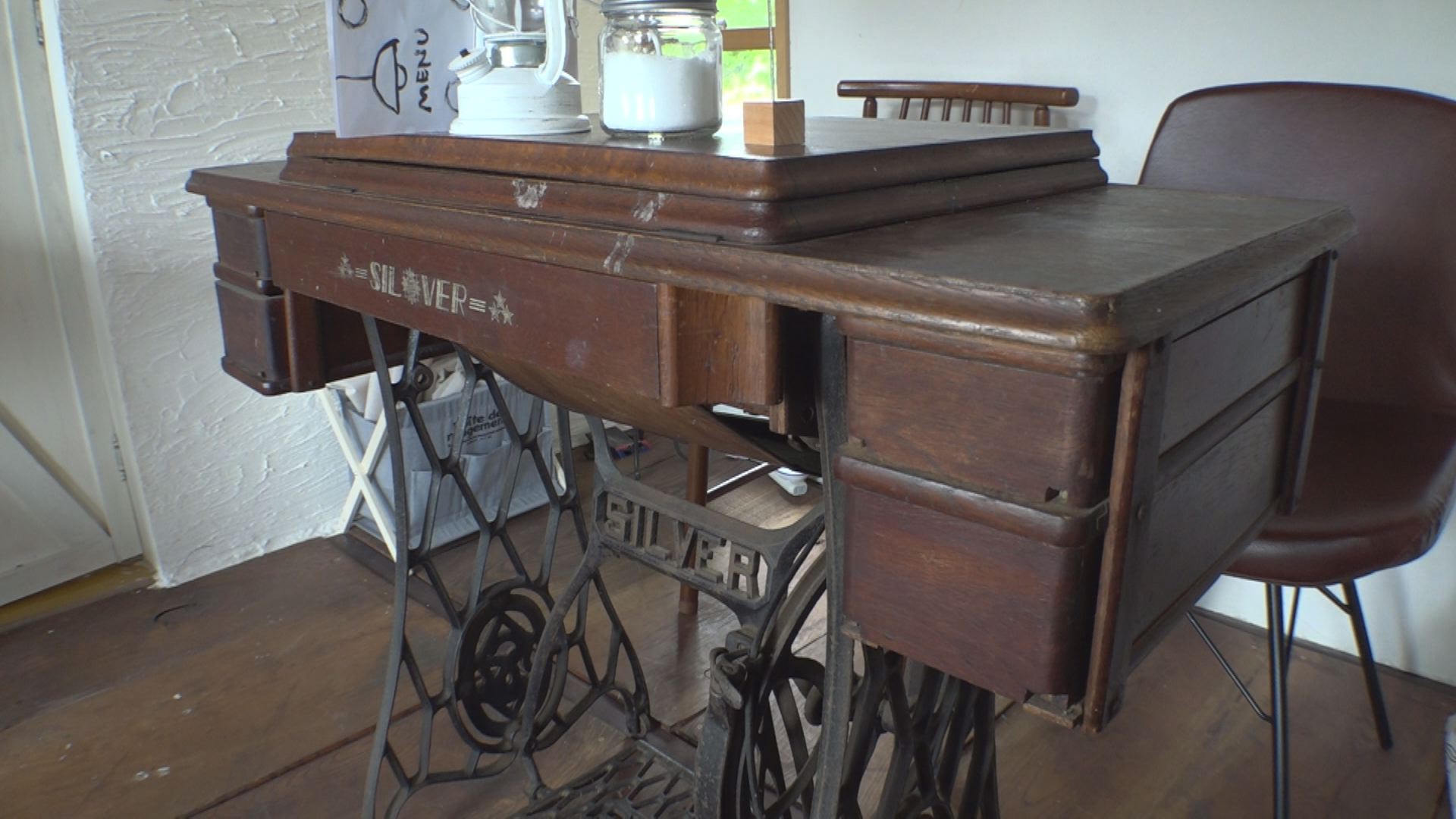 テーブル代わりの足踏みミシンにテラス席からは 板倉の大自然が 一望できる。
